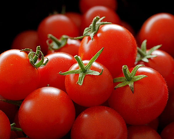Homegrown Tomatoes ~ A close-up photograph of beautiful bright-red homegrown cherry tomatoes with green star-shaped crowns.